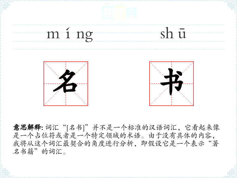 由于“名书”不是一个传统汉语词汇,它可能是现代汉语中新出现的词汇,或者是某个特定领域中的术语。