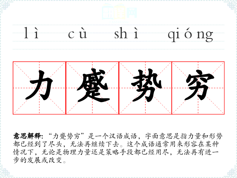 “力蹙势穷”是一个汉语成语,字面意思是指力量和形势都已经到了尽头,无法再继续下去。这个成语通常用来形容在某种情况下,无论是物理力量还是策略手段都已经用尽,无法再有进一步的发展或改变。