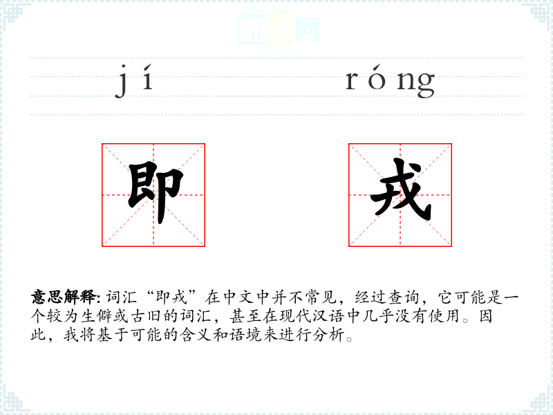 词汇“即戎”在中文中并不常见,经过查询,它可能是一个较为生僻或古旧的词汇,甚至在现代汉语中几乎没有使用。因此,我将基于可能的含义和语境来进行分析。