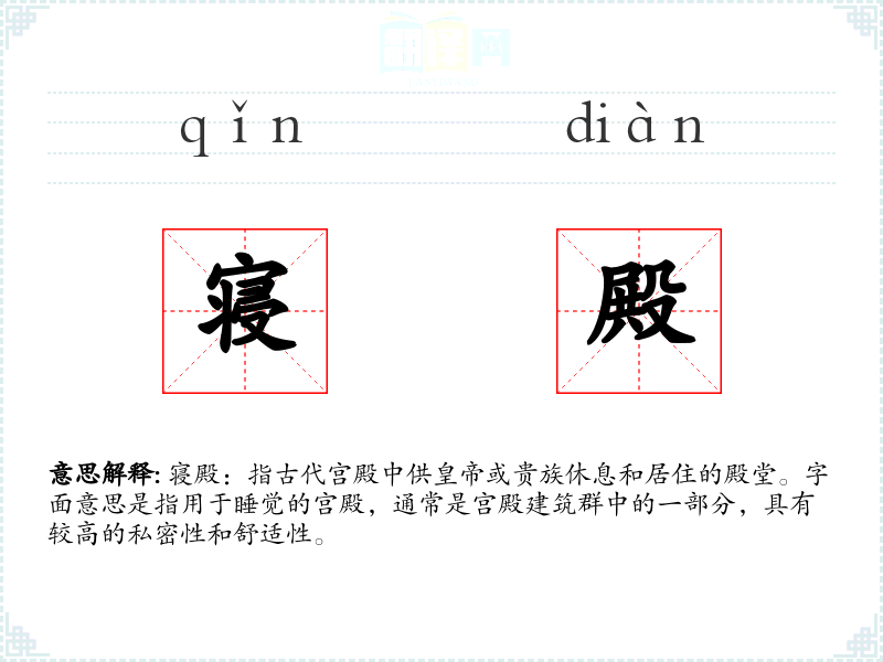 寝殿:指古代宫殿中供**或贵族休息和居住的殿堂。字面意思是指用于睡觉的宫殿,通常是宫殿建筑群中的一部分,具有较高的私密性和舒适性。