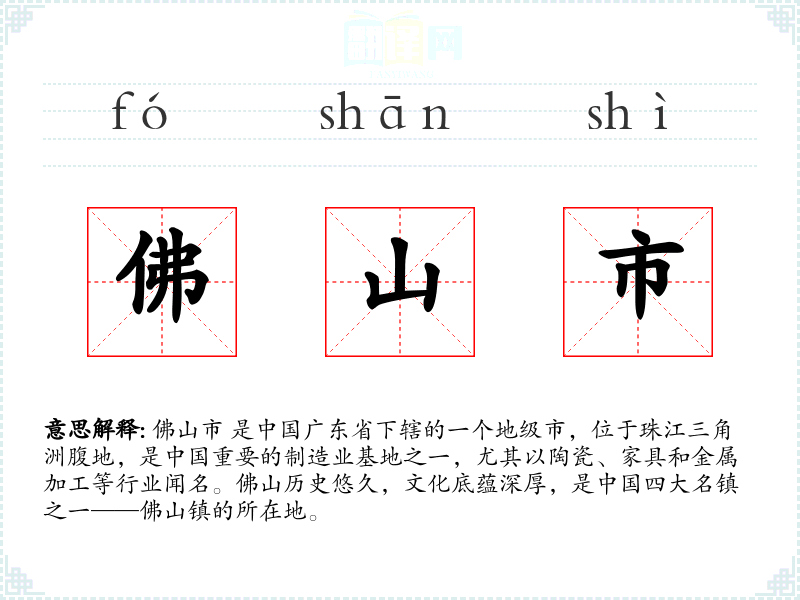 - 反义词:(由于佛山市是一个具体的地理名称,通常不涉及反义词)