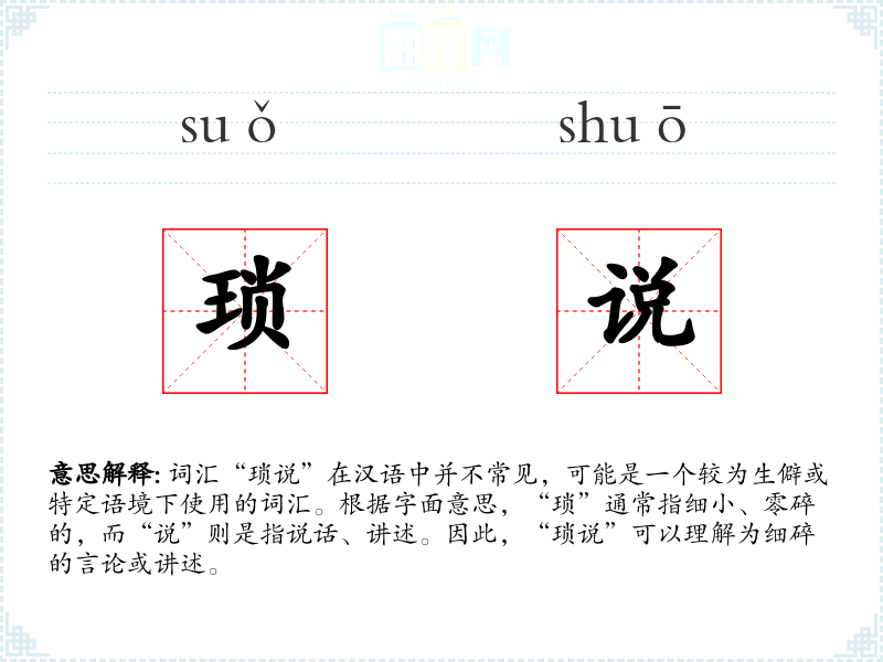 词汇“琐说”在汉语中并不常见,可能是一个较为生僻或特定语境下使用的词汇。根据字面意思,“琐”通常指细小、零碎的,而“说”则是指说话、讲述。因此,“琐说”可以理解为细碎的言论或讲述。