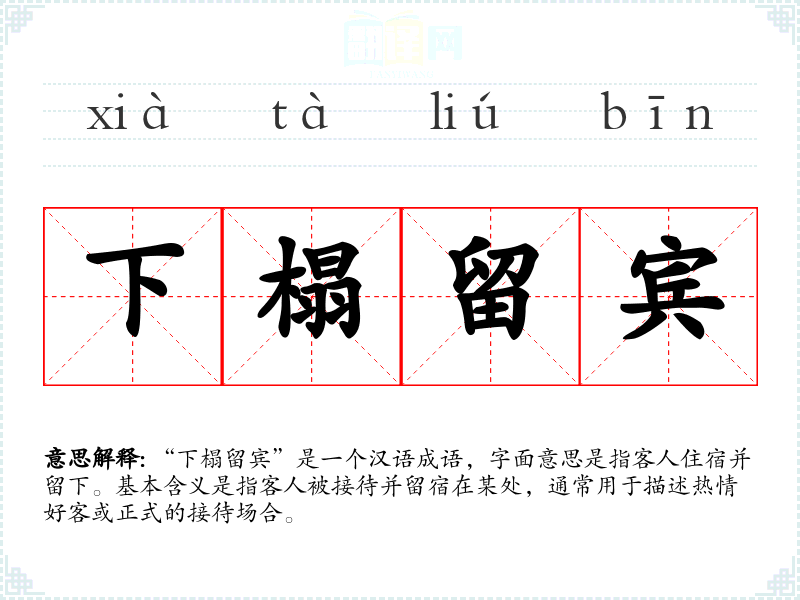 “下榻”原指古代官员或文人出行时在旅途中住宿,后来泛指一般的住宿。“留宾”则是指留下客人。这个成语结合了这两个词,形成了描述接待客人的特定含义。