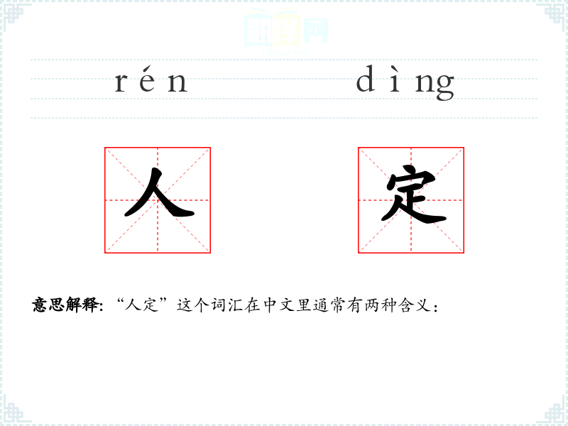- 文学语境:在文学作品中,“人定”常用来形容人物的性格坚定,如“他是个意志坚定的人定之士”。
