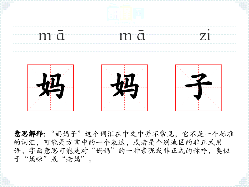 “妈妈子”这个词汇在中文中并不常见,它不是一个标准的词汇,可能是方言中的一个表达,或者是个别地区的非正式用语。字面意思可能是对“妈妈”的一种亲昵或非正式的称呼,类似于“妈咪”或“老妈”。