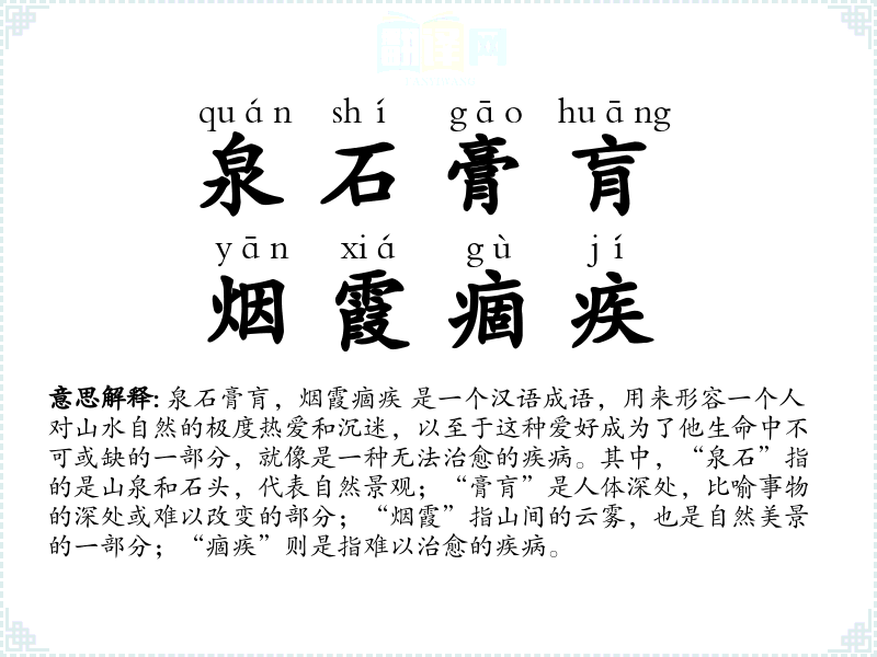 - quán shí gāo huāng,yān xiá gù jí泉石膏肓,烟霞痼疾