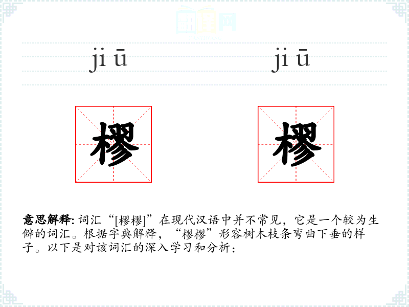 词汇“[樛樛]”在现代汉语中并不常见,它是一个较为生僻的词汇。根据字典解释,“樛樛”形容树木枝条弯曲下垂的样子。以下是对该词汇的深入学习和分析:
