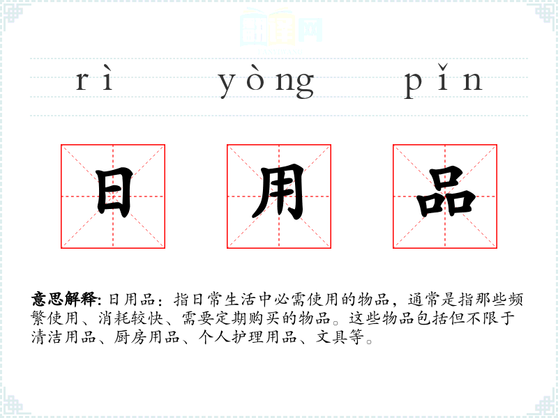 日用品:指日常生活中必需使用的物品,通常是指那些频繁使用、消耗较快、需要定期购买的物品。这些物品包括但不限于清洁用品、厨房用品、个人护理用品、文具等。