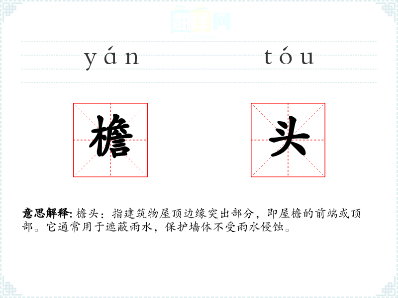 - 专业领域:在建筑学或土木工程中,檐头的设计和功能是重要的考虑因素,涉及到排水、结构稳定性等专业知识。