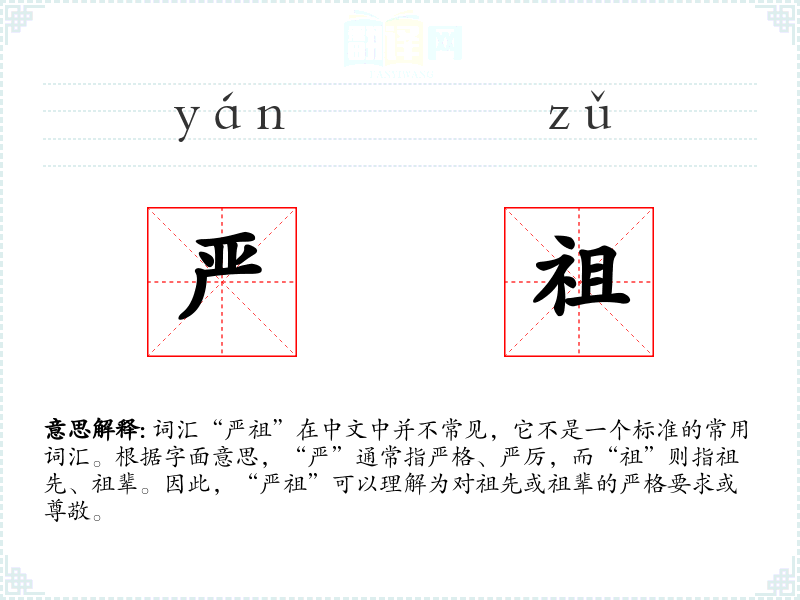 词汇“严祖”在中文中并不常见,它不是一个标准的常用词汇。根据字面意思,“严”通常指严格、严厉,而“祖”则指祖先、祖辈。因此,“严祖”可以理解为对祖先或祖辈的严格要求或尊敬。