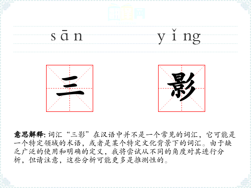 对于“三影”这个词汇,我的理解是有限的,因为它不是一个标准词汇,也没有广泛的使用背景。在语言学习和表达中,它可能更多是一个特定语境下的术语或象征。如果未来遇到具体的使用情境,我的理解可能会有所深化。