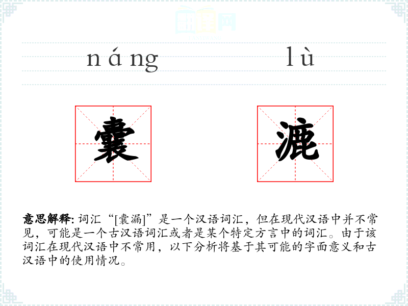 词汇“[囊漏]”是一个汉语词汇,但在现代汉语中并不常见,可能是一个古汉语词汇或者是某个特定方言中的词汇。由于该词汇在现代汉语中不常用,以下分析将基于其可能的字面意义和古汉语中的使用情况。