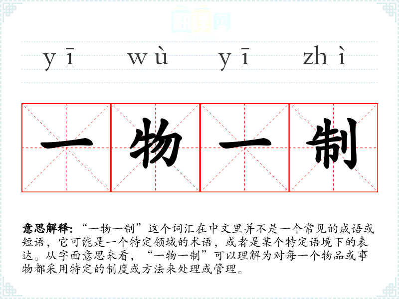 “一物一制”这个词汇在中文里并不是一个常见的成语或短语,它可能是一个特定领域的术语,或者是某个特定语境下的表达。从字面意思来看,“一物一制”可以理解为对每一个物品或事物都采用特定的制度或方法来处理或管理。