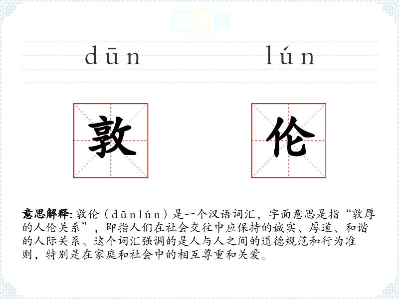 敦伦(dūn lún)是一个汉语词汇,字面意思是指“敦厚的人伦关系”,即指人们在社会交往中应保持的诚实、厚道、和谐的人际关系。这个词汇强调的是人与人之间的道德规范和行为准则,特别是在家庭和社会中的相互尊重和关爱。