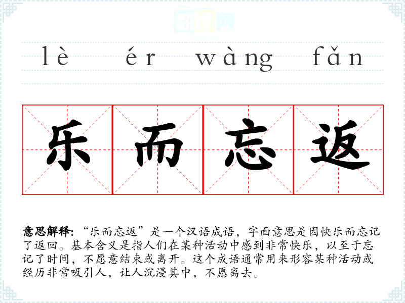 “乐而忘返”是一个汉语成语,字面意思是因快乐而忘记了返回。基本含义是指人们在某种活动中感到非常快乐,以至于忘记了时间,不愿意结束或离开。这个成语通常用来形容某种活动或经历非常吸引人,让人沉浸其中,不愿离去。