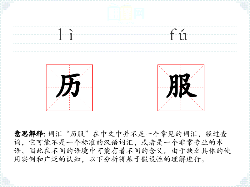 词汇“历服”在中文中并不是一个常见的词汇,经过查询,它可能不是一个标准的汉语词汇,或者是一个非常专业的术语,因此在不同的语境中可能有着不同的含义。由于缺乏具体的使用实例和广泛的认知,以下分析将基于假设性的理解进行。