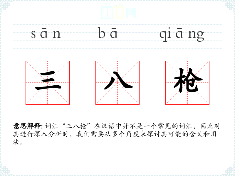 “三八枪”这个词汇的分析表明,它可能是一个特定语境下的俚语或术语,对于大多数人来说并不常见。在语言学习和表达中,了解这样的词汇可以帮助我们更好地理解特定社群的文化和语言习惯。