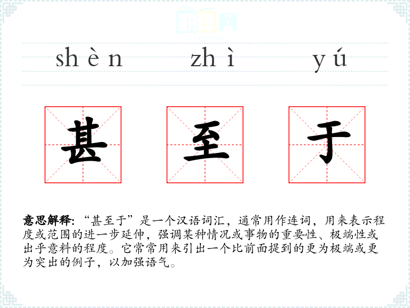 “甚至于”由“甚至”和“于”两个词组成。其中,“甚至”源自古代汉语,意为“甚至”,而“于”是一个常见的介词,表示范围或程度。在现代汉语中,“甚至于”作为一个固定搭配,用来加强语气。