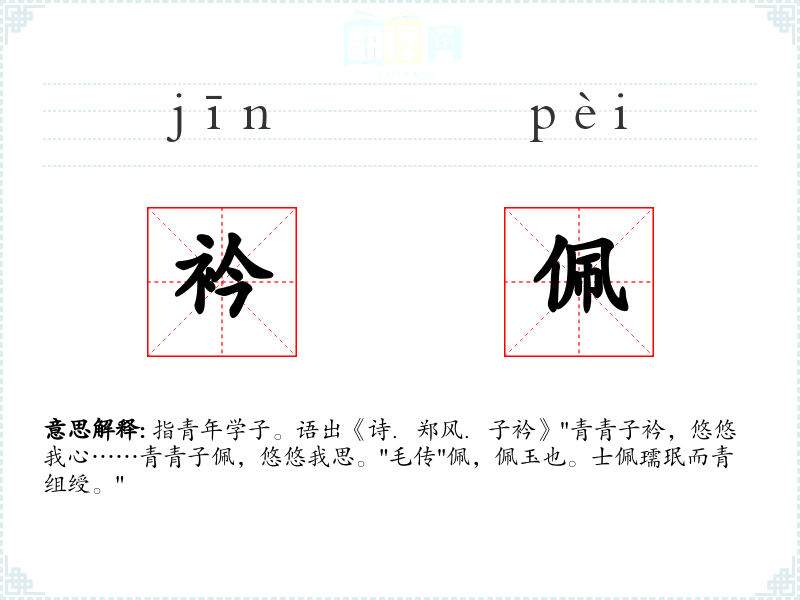 指青年学子。语出《诗.郑风.子衿》"青青子衿,悠悠我心……青青子佩,悠悠我思。"毛传"佩,佩玉也。士佩瓀珉而青组绶。"