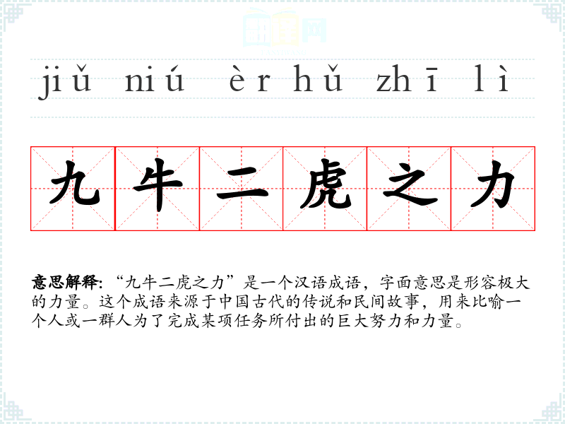 “九牛二虎之力”这个成语的词源可以追溯到**古代的传说和民间故事。在古代,牛和虎都是力量和勇气的象征,因此用“九牛二虎”来形容极大的力量。随着时间的推移,这个成语被广泛应用于各种语境中,成为汉语中常用的表达方式。