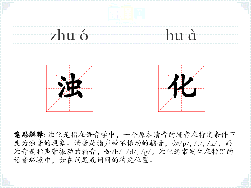浊化是指在语音学中,一个原本清音的辅音在特定条件下变为浊音的现象。清音是指声带不振动的辅音,如/p/, /t/, /k/,而浊音是指声带振动的辅音,如/b/, /d/, /g/。浊化通常发生在特定的语音环境中,如在词尾或词间的特定位置。