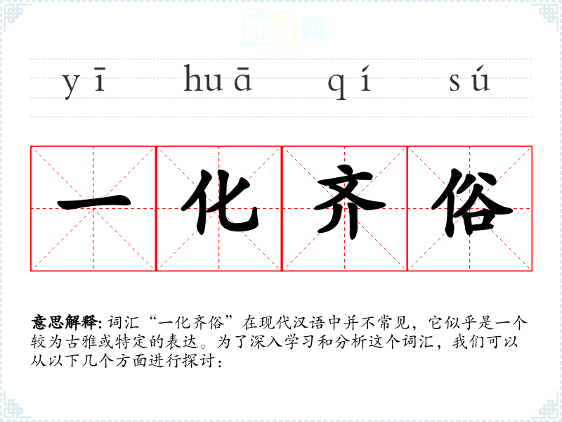词汇“一化齐俗”在现代汉语中并不常见,它似乎是一个较为古雅或特定的表达。为了深入学*和分析这个词汇,我们可以从以下几个方面进行探讨: