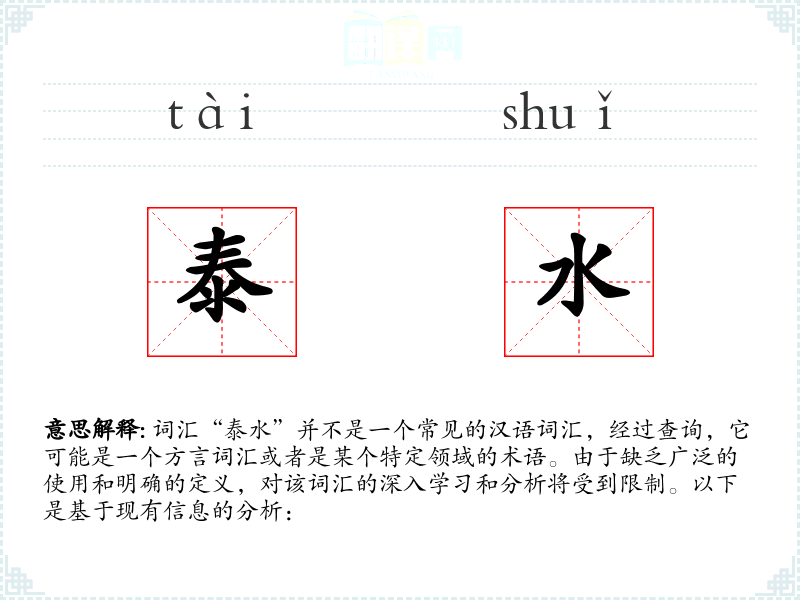 综上所述,词汇“泰水”由于缺乏明确的定义和广泛的使用,对其进行深入学习和分析存在困难。如果该词汇是某个特定地区或领域的术语,建议进一步查阅相关资料或咨询该领域的专家以获取更多信息。