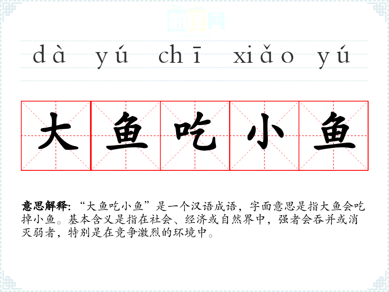 “大鱼吃小鱼”是一个汉语成语,字面意思是指大鱼会吃掉小鱼。基本含义是指在社会、经济或自然界中,强者会吞并或消灭弱者,特别是在竞争激烈的环境中。