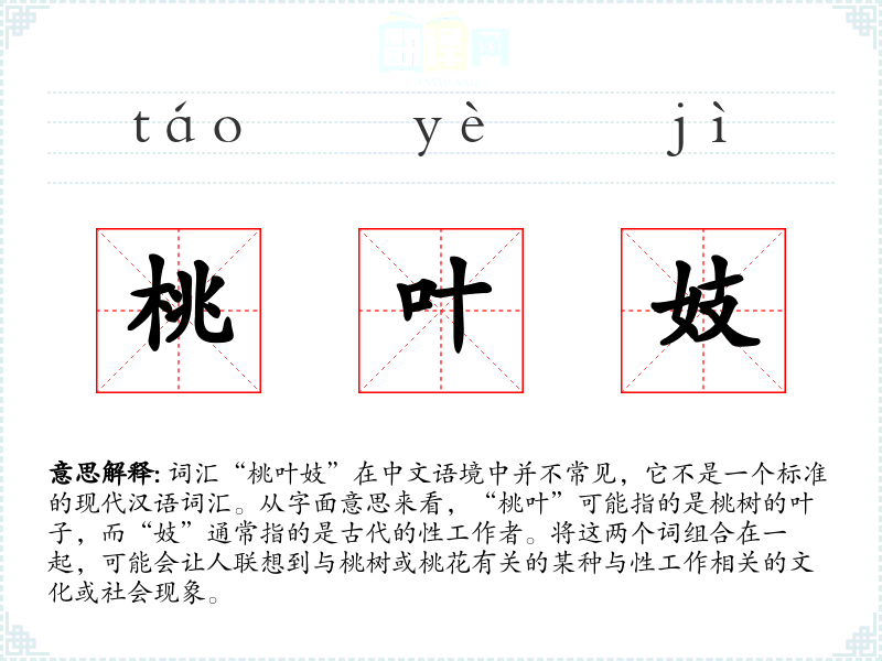 - 词源:这个词汇可能是由“桃叶”和“妓”两个词组合而成,具体的历史演变不详。