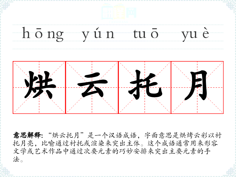 “烘云托月”是一个汉语成语,字面意思是烘烤云彩以衬托月亮,比喻通过衬托或渲染来突出主体。这个成语通常用来形容文学或艺术作品中通过次要元素的巧妙安排来突出主要元素的手法。
