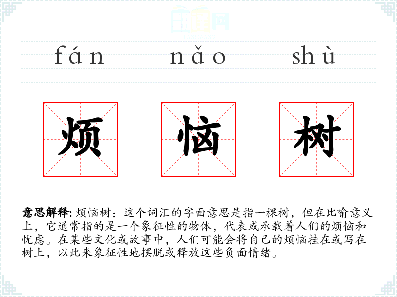 烦恼树:这个词汇的字面意思是指一棵树,但在比喻意义上,它通常指的是一个象征性的物体,代表或承载着人们的烦恼和忧虑。在某些文化或故事中,人们可能会将自己的烦恼挂在或写在树上,以此来象征性地摆脱或释放这些负面情绪。