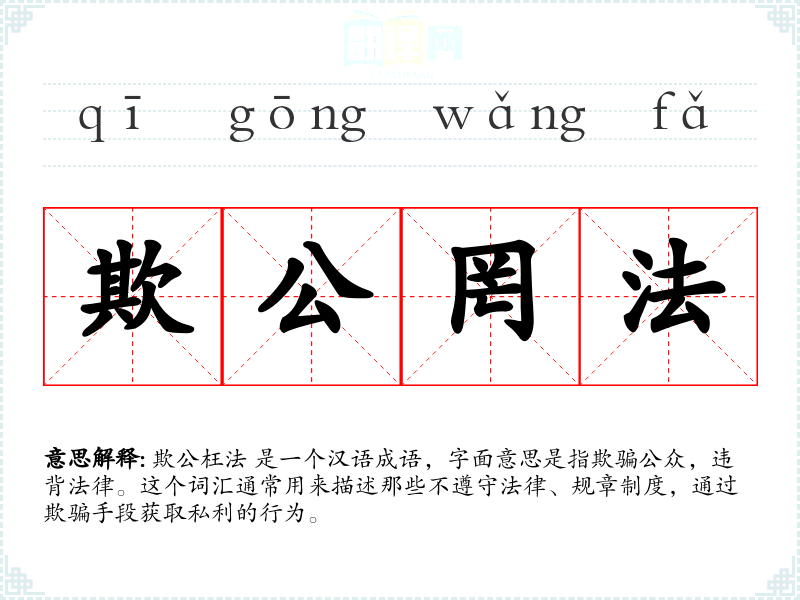 欺公枉法 是一个汉语成语,字面意思是指欺骗公众,违背法律。这个词汇通常用来描述那些不遵守法律、规章制度,通过欺骗手段获取私利的行为。