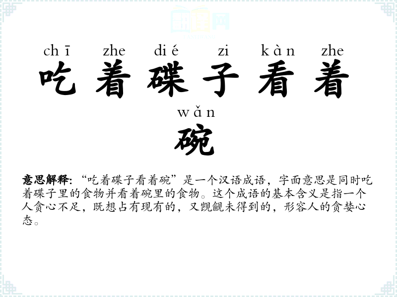 - chī zhe dié zi kàn zhe wǎn吃着碟子看着碗