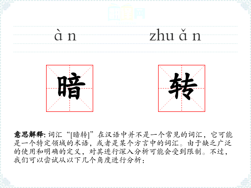 “[暗转]”作为一个不常见的词汇,其含义和使用需要具体的上下文。在语言学习和表达中,了解特定词汇的上下文和用法是非常重要的。对于“[暗转]”这样的词汇,我们需要更多的信息和语境来准确理解和使用它。