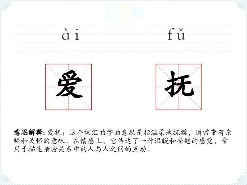 爱抚:这个词汇的字面意思是指温柔地抚摸,通常带有亲昵和关怀的意味。在情感上,它传达了一种温暖和安慰的感觉,常用于描述亲密关系中的人与人之间的互动。