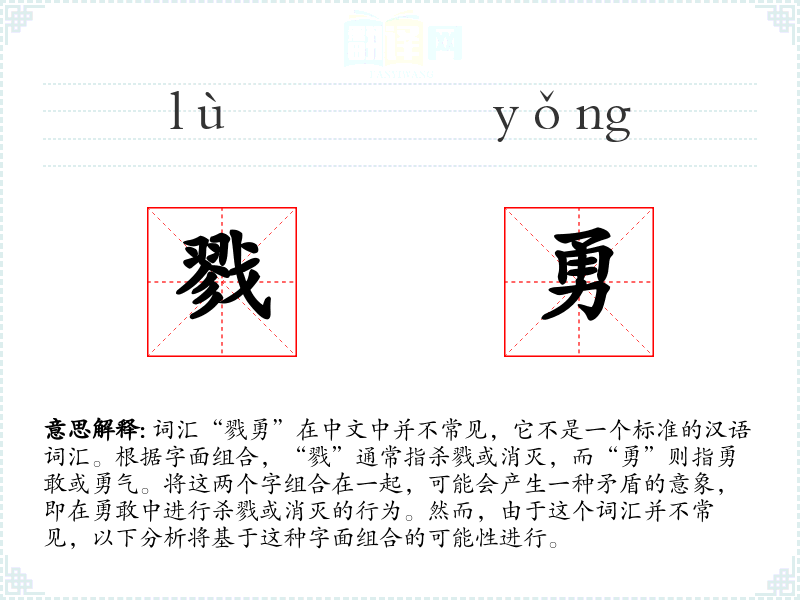 由于“戮勇”不是一个标准词汇,它在文学、口语或专业领域中的使用非常有限。如果出现在文学作品中,可能是为了创造一种特定的氛围或描述一种复杂的情感状态。