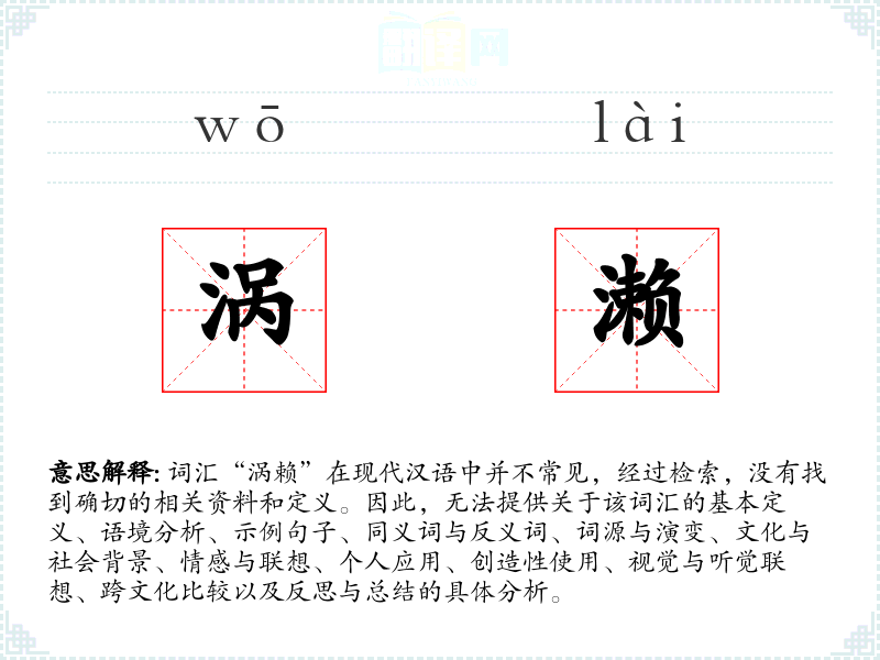 如果“涡赖”是一个特定领域或方言中的词汇,可能需要更专业的资料或当地人的解释才能进行深入分析。如果这是一个打字错误或者特定文化中的术语,建议提供更多上下文信息以便进行准确分析。