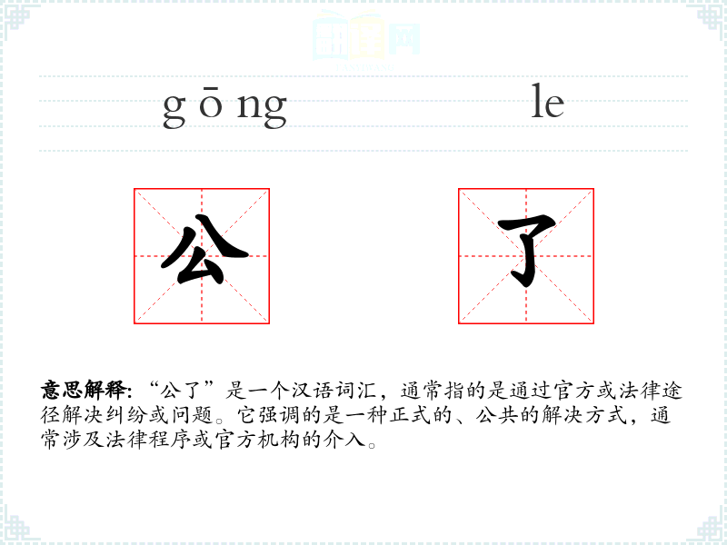 - 文学语境:在文学作品中,“公了”可能用来描述角色在面对冲突时选择法律途径解决问题,强调其正式性和权威性。