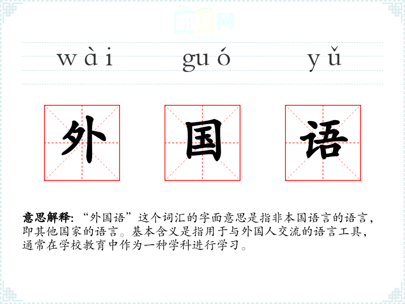 “外国语”这个词汇的字面意思是指非本国语言的语言,即其他国家的语言。基本含义是指用于与外国人交流的语言工具,通常在学校教育中作为一种学科进行学习。