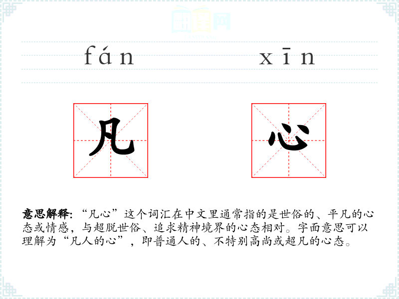 “凡心”这个词汇在中文里通常指的是世俗的、平凡的心态或情感,与超脱世俗、追求精神境界的心态相对。字面意思可以理解为“凡人的心”,即普通人的、不特别高尚或超凡的心态。