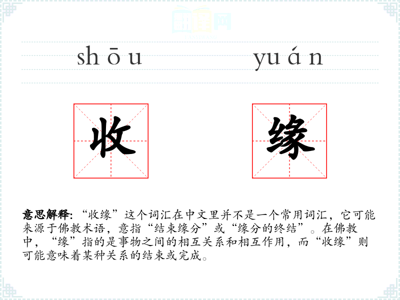 - 反义词:结缘、续缘(与“收缘”相对,表示建立或继续缘分)