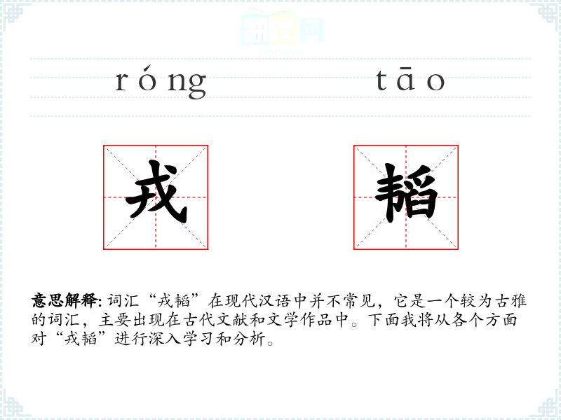 词汇“戎韬”在现代汉语中并不常见,它是一个较为古雅的词汇,主要出现在古代文献和文学作品中。下面我将从各个方面对“戎韬”进行深入学*和分析。