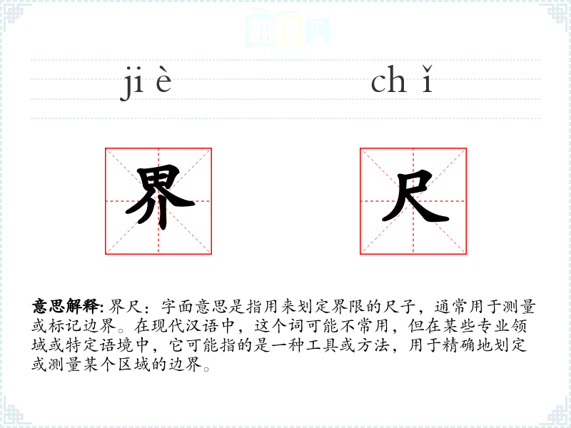 界尺:字面意思是指用来划定界限的尺子,通常用于测量或标记边界。在现代汉语中,这个词可能不常用,但在某些专业领域或特定语境中,它可能指的是一种工具或方法,用于精确地划定或测量某个区域的边界。