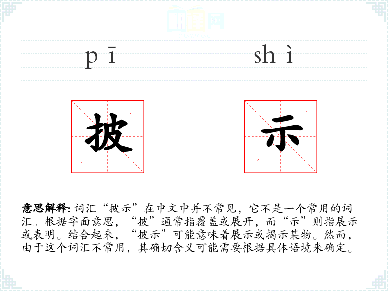 - 词源:“披”源自古代汉语,意为覆盖或展开;“示”源自古代汉语,意为展示或表明。