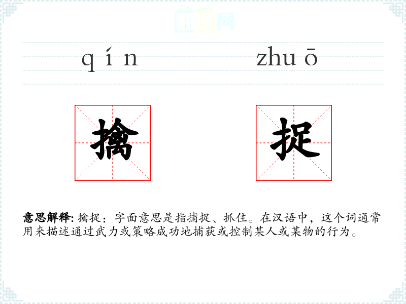 擒捉:字面意思是指捕捉、抓住。在汉语中,这个词通常用来描述通过武力或策略成功地捕获或控制某人或某物的行为。