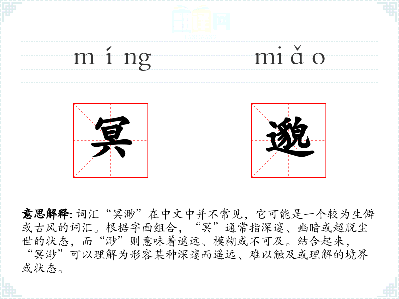 词汇“冥渺”在中文中并不常见,它可能是一个较为生僻或古风的词汇。根据字面组合,“冥”通常指深邃、幽暗或超脱尘世的状态,而“渺”则意味着遥远、模糊或不可及。结合起来,“冥渺”可以理解为形容某种深邃而遥远、难以触及或理解的境界或状态。