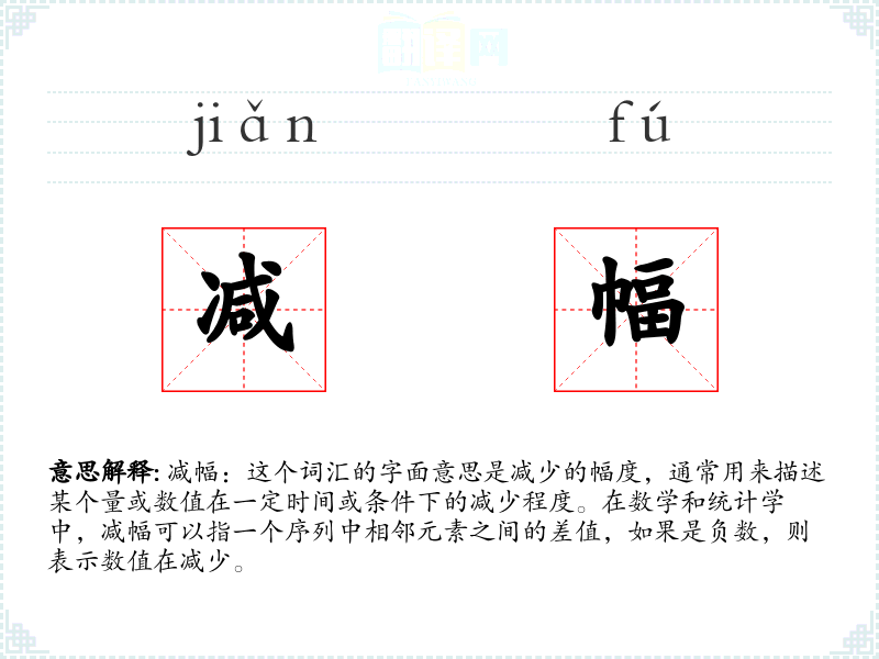 词源:减幅这个词是由“减”和“幅”两个字组合而成,其中“减”表示减少,“幅”原指布匹的宽度,后引申为程度或范围。 演变:随着经济和统计学的发展,减幅这个词在现代汉语中被广泛应用于描述各种减少的情况。