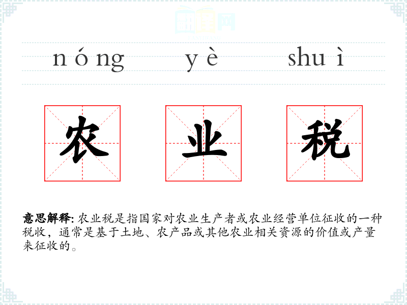 - 反义词:农业补贴(与农业税相对,是国家对农业的财政支持)