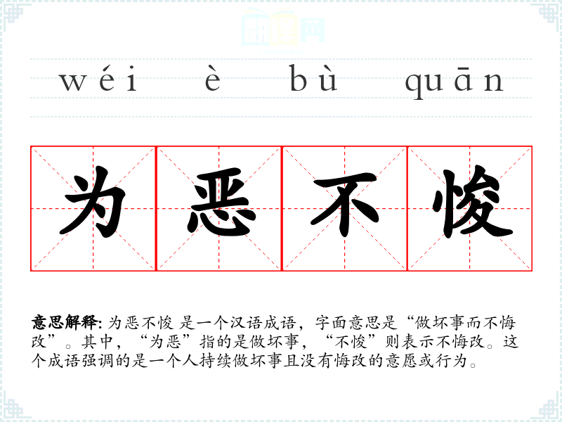 为恶不悛 是一个汉语成语,字面意思是“做坏事而不悔改”。其中,“为恶”指的是做坏事,“不悛”则表示不悔改。这个成语强调的是一个人持续做坏事且没有悔改的意愿或行为。
