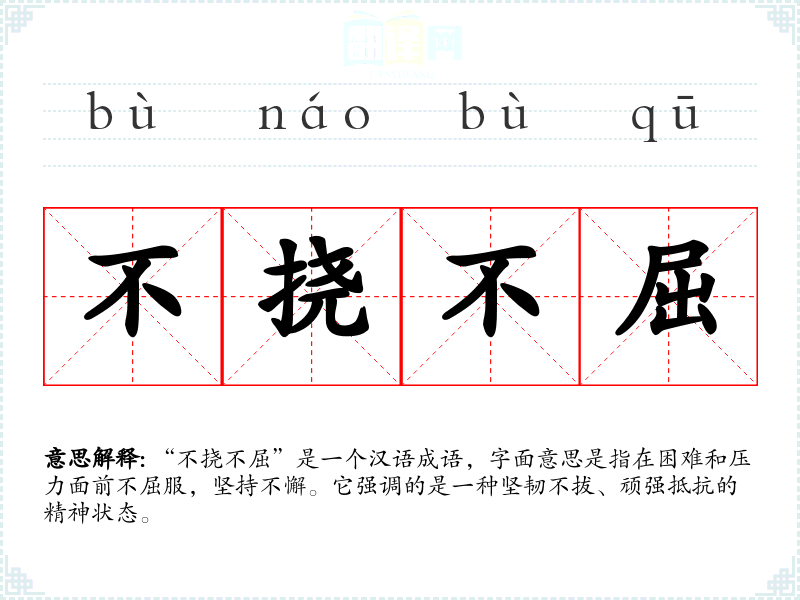 “不挠不屈”是一个汉语成语,字面意思是指在困难和压力面前不屈服,坚持不懈。它强调的是一种坚韧不拔、顽强抵抗的精神状态。